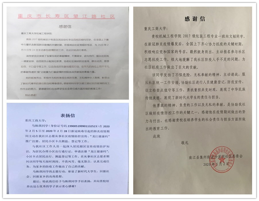 “青春由磨砺而出彩,人生因奋斗而升华”新冠肺炎疫情发生以来,重工商大志愿者们以青春的担当,迅速响应,积极投入,同在一线英勇奋战的广大疫情防控人员一道,不畏艰险、冲锋在前,为夺取疫情防控的胜利注入了鲜活的青春力量。3月以来,我校陆续收到河北曲周共青团、重庆永川五间镇共青团、重庆渝北区古路镇人民政府、山西临汾尧都区刘村镇马站村党支部等单位寄来的200余封感谢信,对我校青年在抗“疫”中的表现给予了高度的肯定和赞扬。