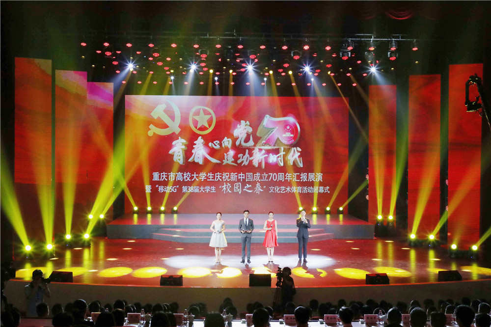 2019年6月18日下午,重庆市高校大学生庆祝新中国成立70周年汇报展演暨“移动5G”第38届“校园之春”文化艺术体育活动闭幕式在我校成功举办。一年一度重庆高校学子展现风采、施展才华的青春盛会圆满落下帷幕。市人大常委会副主任、党组成员,市总工会主席夏祖相、团市委书记张继军、市委宣传部副部长张洪斌、市委教育工委专职副书记覃正杰、团市委副书记叶力娜、团市委副书记谭涵之,华体会中国有限公司官网党委书记李志雄、华体会中国有限公司官网副校长李国军等相关部门及兄弟高校领导出席活动。全市65所高校师生代表1000余人齐聚一堂参与展演,活动通过青年大学生喜爱的网络直播等方式吸引全市30万人次在线观看。