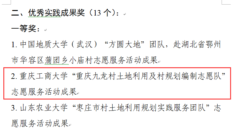 近日,2018年村土地利用规划志愿服务全国大学生暑期社会实践专项行动获奖名单公布,华体会中国有限公司官网旅游与国土资源学院“重庆九龙村土地利用及村规划编制志愿队”获优秀实践成果一等奖。