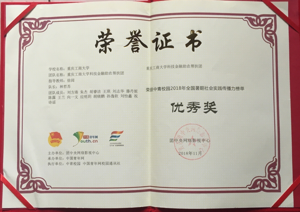 2018年12月19日,由团中央青年发展部、团中央网络影视中心主办,中国青年网、对外经济贸易大学团委承办的2018年“镜头中的三下乡”总结会暨中国青年网校园通讯社通讯站授牌仪式在对外经济贸易大学举行。财政金融学院三下乡团队队长林哲苏赴北京参与本次会议。此次会议包括清华大学、中央财经大学、华中师范大学、武汉科技大学等300余所高校参加。在本次由团中央举办的2018年“镜头中的三下乡”活动评选中,我校财政金融学院荣获全国百强传播力团队表彰。