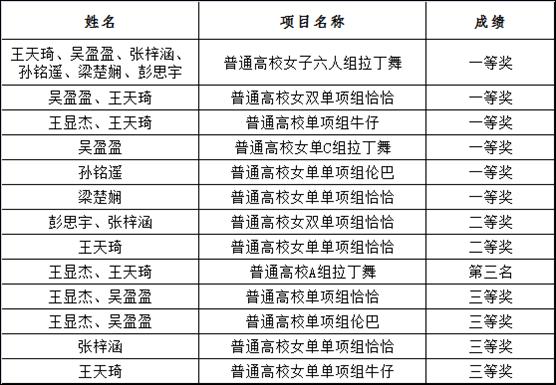 5月1—3日,由重庆市教育委员会、重庆市文化委员会主办的重庆市第七届青少年国际标准舞锦标赛在沙坪坝体育馆举行。我校华艺拉丁舞社团吴盈盈等7名同学参加了比赛,共获得6个一等奖,是参加此项比赛以来取得的最好成绩。