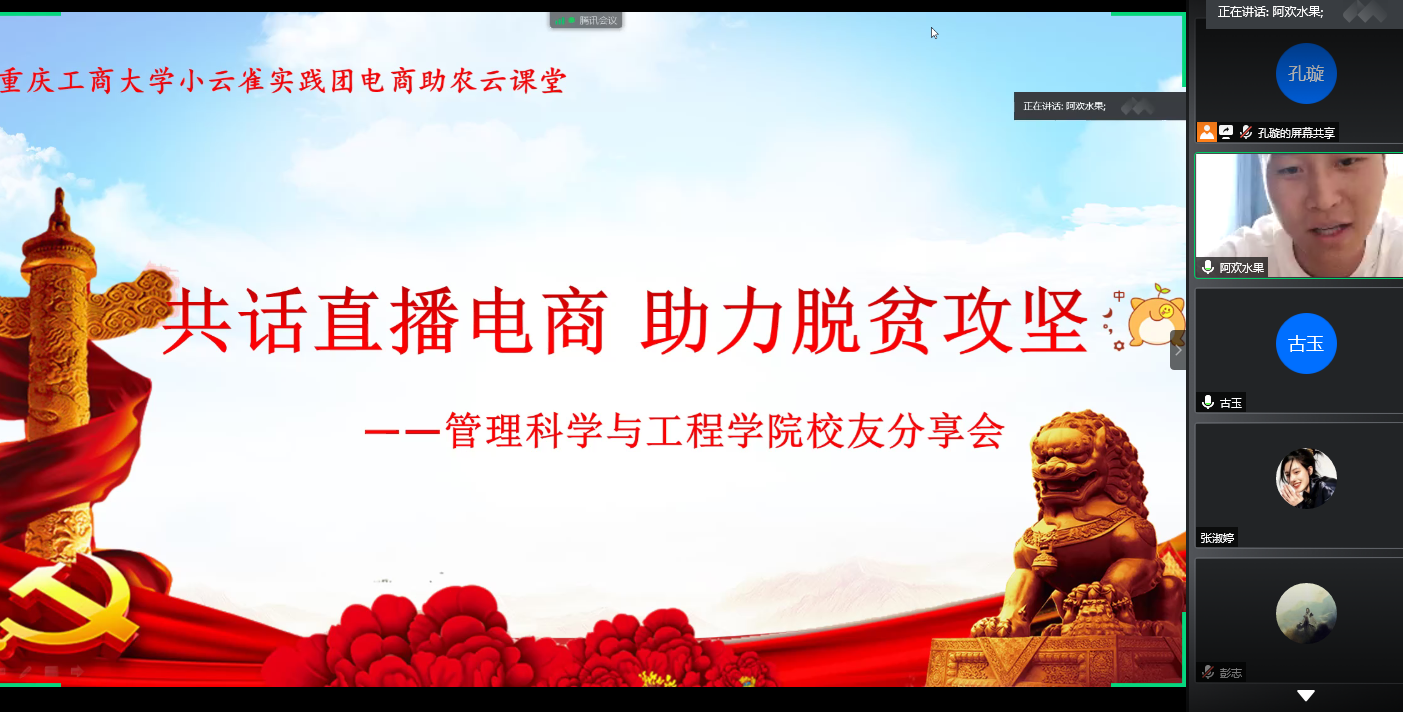管理科学与工程学院以小云雀电商助农团为代表的青年大学生自2014年以来一直开展电商助农的服务活动。今年是脱贫攻坚的决战决胜之年,为提升学生实践能力,推动学生更好地开展助力脱贫攻坚的实践活动,7月28日下午,管理科学与工程学院邀请到具备丰富电商直播经验,多次参加公益电商助农活动的优秀校友胡欢和史亚飞开展以“共话直播电商,助力脱贫攻坚”为主题的校友分享会。学院党委副书记陈春洁、学生工作办公室主任古纯玉、电子商务系主任孟伟及部分教师代表和同学们参加了此次分享会。