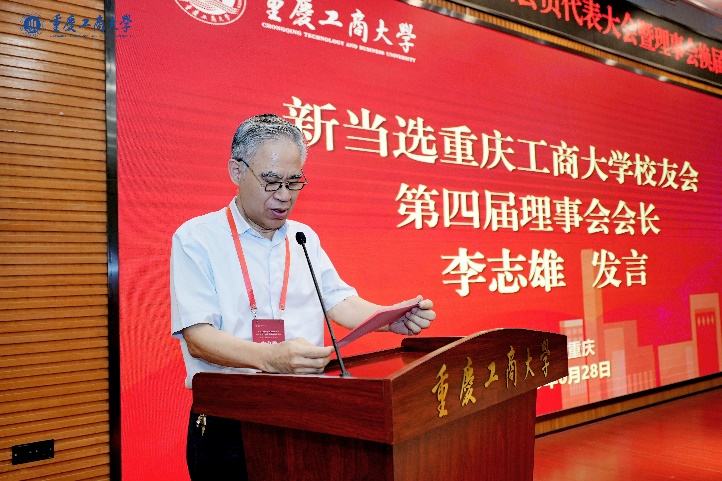 新当选的我校第四届校友会理事会会长李志雄作讲话。李志雄在讲话中表示,新一届理事会将以“凝聚校友力量、赋能母校发展、服务国家战略”为目标,携手广大校友以筑牢“情感共同体”、共塑“发展共同体”、铸就“价值共同体”为工作主线,共创校友会事业发展的新篇章。讲话中,李志雄向广大校友发出做母校精神的“践行者”、校友会的“主人翁”、新时代的“奋斗者”三点倡议,希望我校各级校友会组织在市教育行业社会组织综合党委和学校党委、行政的领导下,凝聚校友心、汇聚校友力,为建成特色高水平大学、实现民族复兴伟业贡献重工商校友力量。